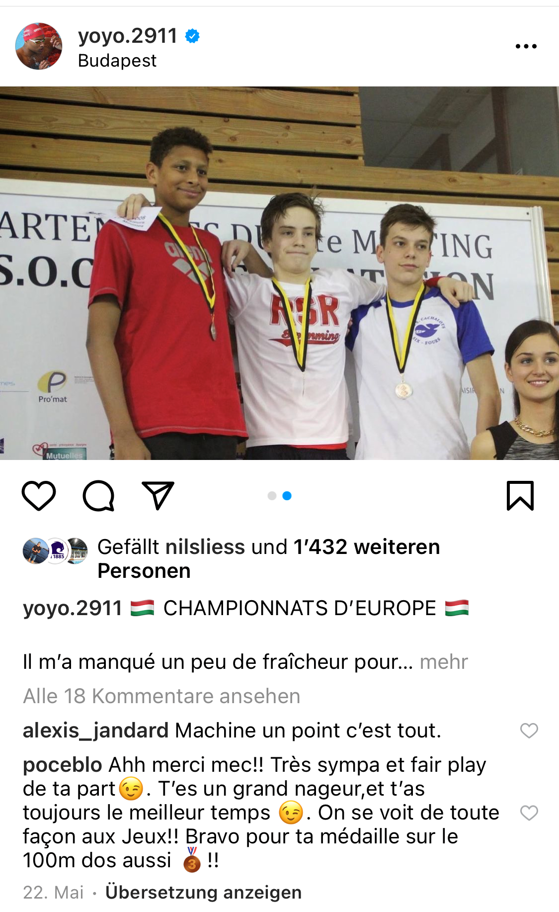 Lors des CE de Budapest, il a su transformer ces paroles en actes et a décroché la médaille de bronze au 200 dos grâce à une finale endiablée. Il a battu son concurrent et collègue français Yohann Ndoyé Brouard de 4 centièmes de seconde. Ce dernier l'a félicité d'un geste sympathique sur les médias sociaux. Ndoyé Brouard avait auparavant remporté le bronze au 100 dos.