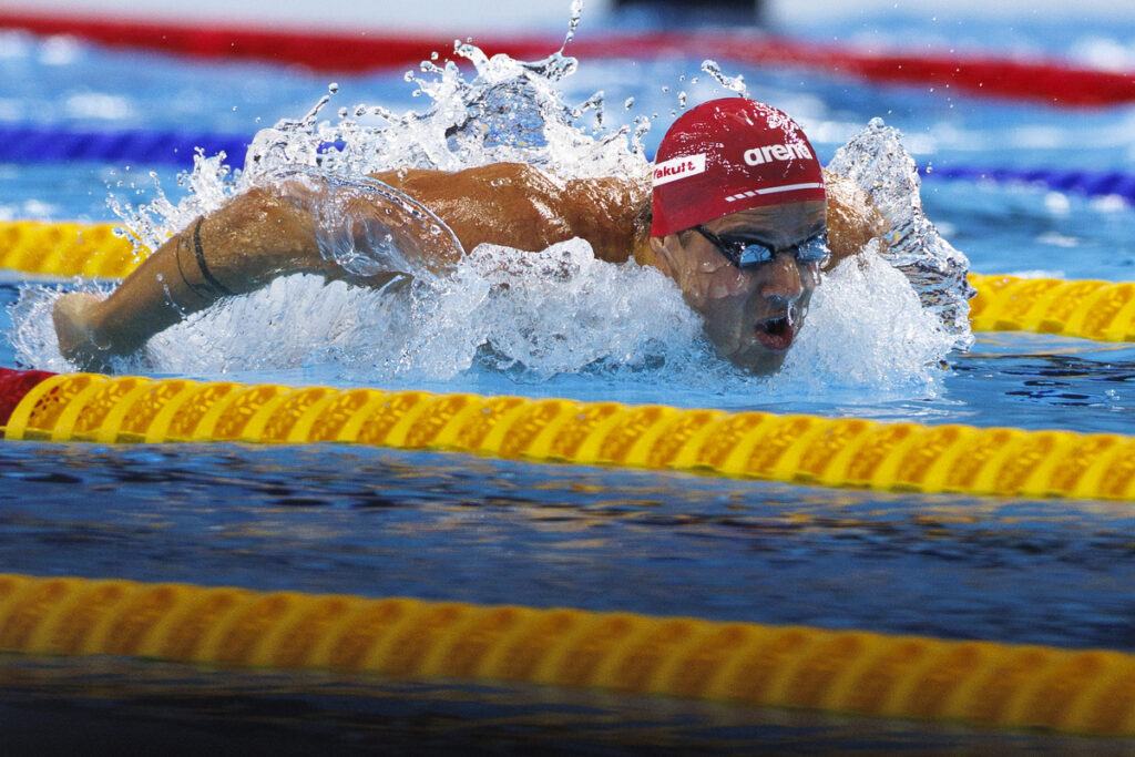 Noe PONTI of Switzerland competes in the Men's 100m Butterfly Heats during the swimming events of the 22nd World Aquatics Championships - Singapore 2025 in Singapore, Singapore, Friday, Aug. 1, 2025. (Photo by Patrick B. Kraemer / MAGICPBK)