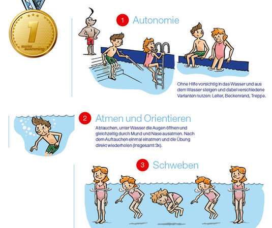 Jeux et histoires doivent rendre l’apprentissage amusant et permettre d’obtenir des résultats positifs ; l‘enthousiasme des enfants pour les cours de natation reste intact et les motive à en suivre d’autres.