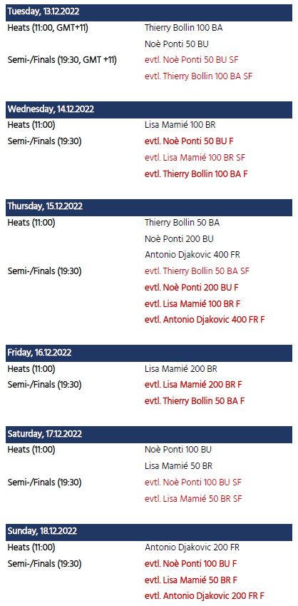 Pour une fois, il n'y aura pas de relais suisse à Melbourne, ce qui est déjà presque inhabituel pour l'équipe suisse. Les courses individuelles des Suisses peuvent être consultées dans le tableau ci-dessous. Nous souhaitons à nos nageurs et nageuses beaucoup de succès à Down Under !