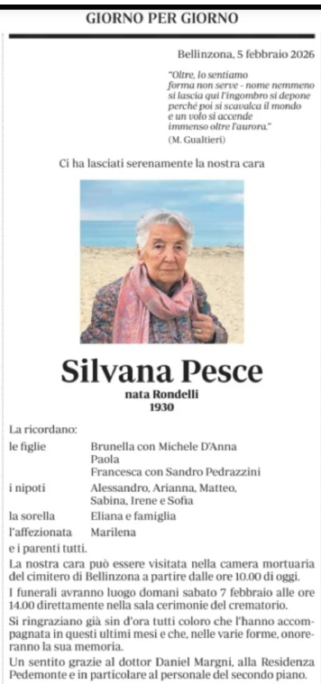 In stiller Trauer nehmen wir Abschied von Silvana Pesce, die am 5. Februar 2026 im Alter von 96 Jahren verstorben ist.
