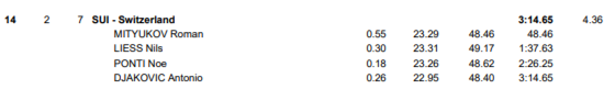 Sicher hätte man sich einen Schweizer Rekord erhofft über die 4x100 Freistilstaffel. Völlig ausser Reichweite war die Finalqualifikation ja nicht. Mit einer Leistung von 3:14.65 verfehlten sie den Final um 1,5 Sekunden. Sie hätten ihren Rekord um gut 3 Zehntel unterbieten müssen, um in die Top 8 vorzustossen. Roman Mityukov hatte sehr gut ausgesehen als Startschwimmer, nachdem er in 48.46 als Zweiter in seinem Lauf und als insgesamt viertschnellster Startschwimmer angeschlagen hatte. Letztlich waren die vier jungen Schweizer alle etwas langsamer unterwegs als bei ihrem Rekordlauf in Budapest.