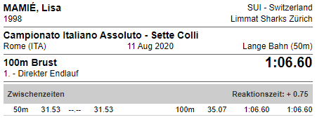 Lisa Mamiè erfreute mit ihrer zweitbesten Leistung über 100 Brust in den Vorläufen. Mit der Zeit von 1:06.76 qualifizierte sie sich souverän für den Halbfinal von Morgen. Ihre Durchgangszeit war gar schneller als bei ihrem Rekord, am Schluss fehlten nur 16 Hundertstelsekunden für eine neue Bestmarke. Die Halbfinalqualifikation ist ein grosser Erfolg für Mamié. Die Abstände sind gering, einzig Tatjana Schoenmaker (Südafrika) liegt etwas in Front. Selbst Olympiasiegerin und Weltrekordhalterin Lilly King atmete schwer nach ihrem Vorlauf. Ihre Zeit von 1:05.55 war gut 1,2 schneller als Mamié.