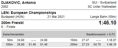 - Halbfinals 200 Freistil Herren: Beginn Lauf 1 um 3 Uhr 37 (Schweizer Zeit), Lauf 2 um 3 Uhr 43 mit Antonio auf Bahn 8.