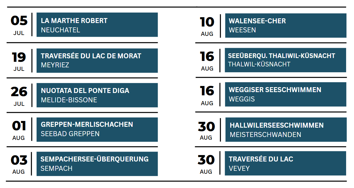 Es gehören insgesamt 10 Seeüberquerungen verteilt in der ganzen Schweiz zur Swiss Aquatics Lake Crossing Trophy. Hier findest du eine Übersicht: Maps